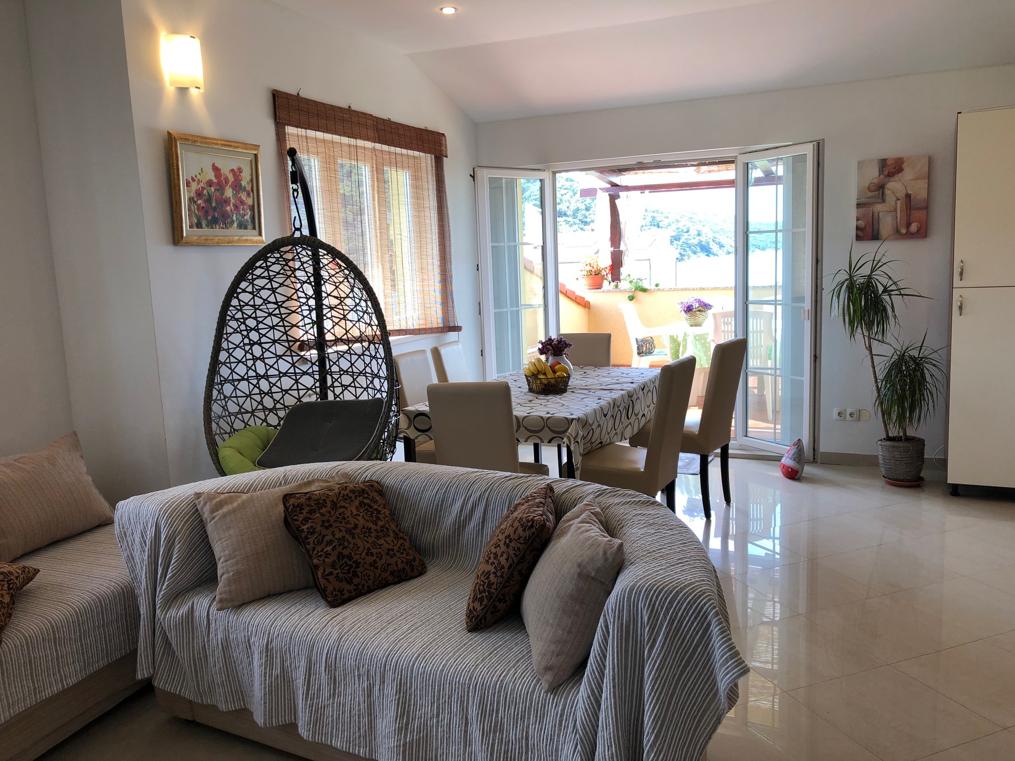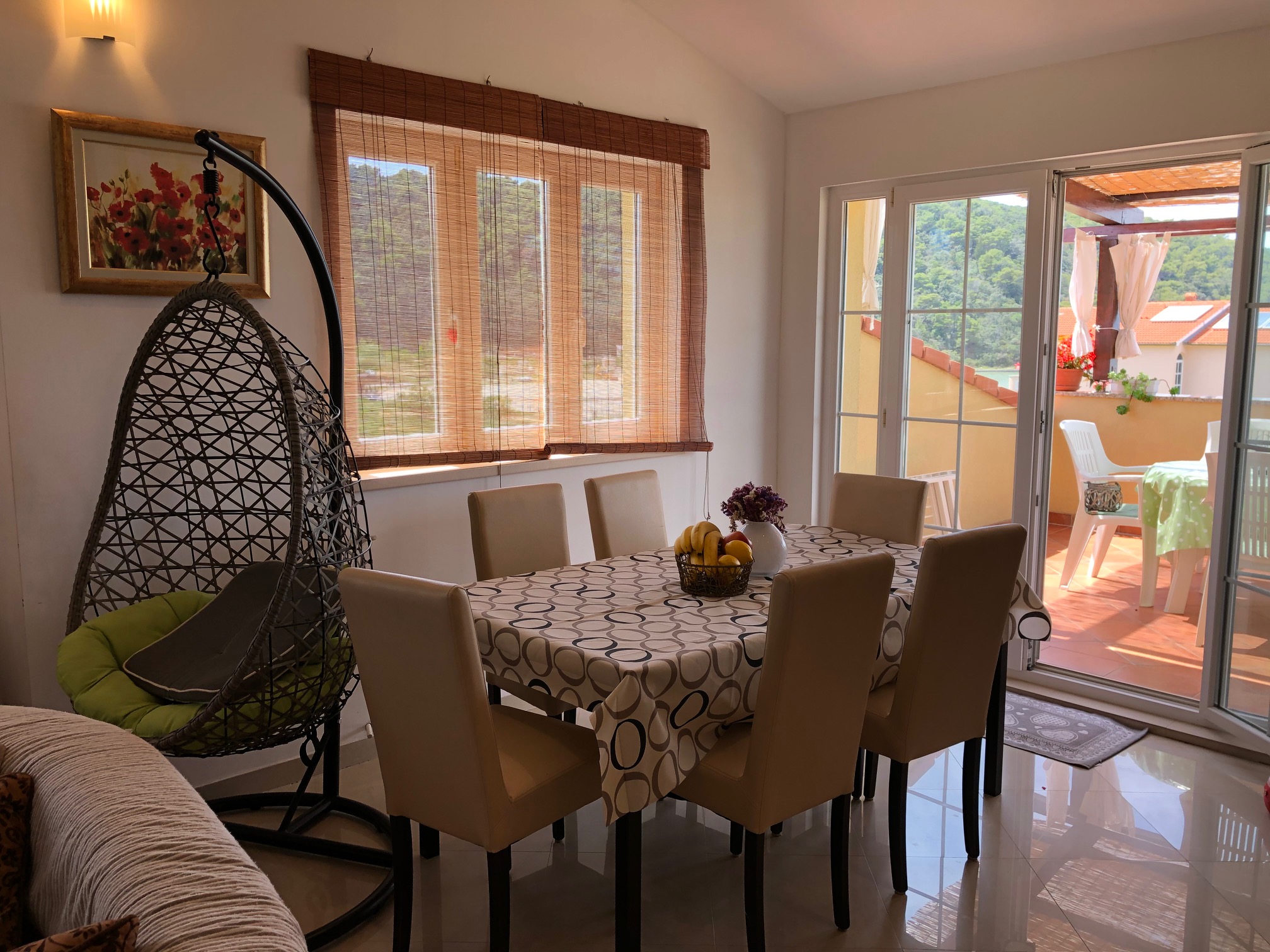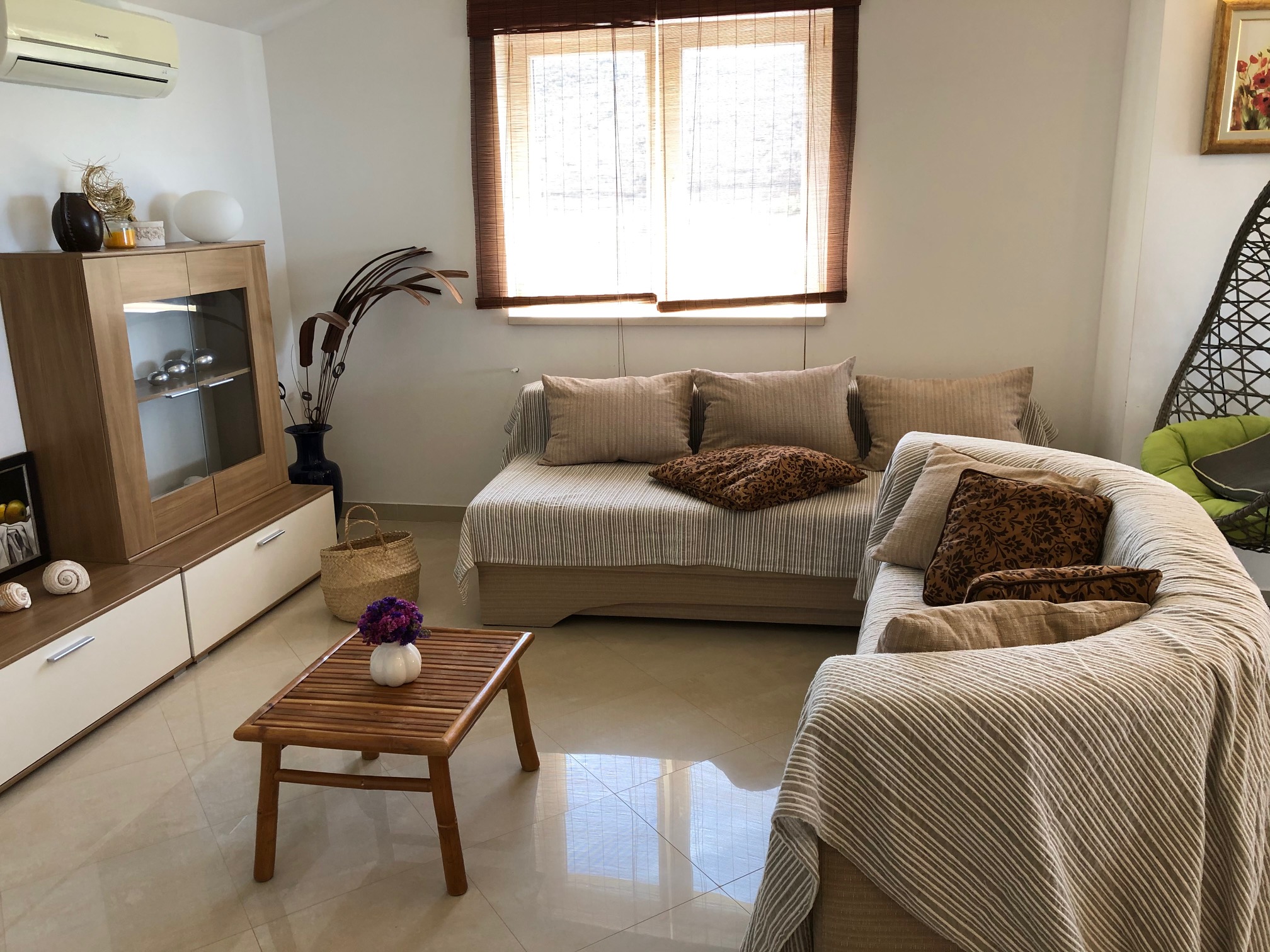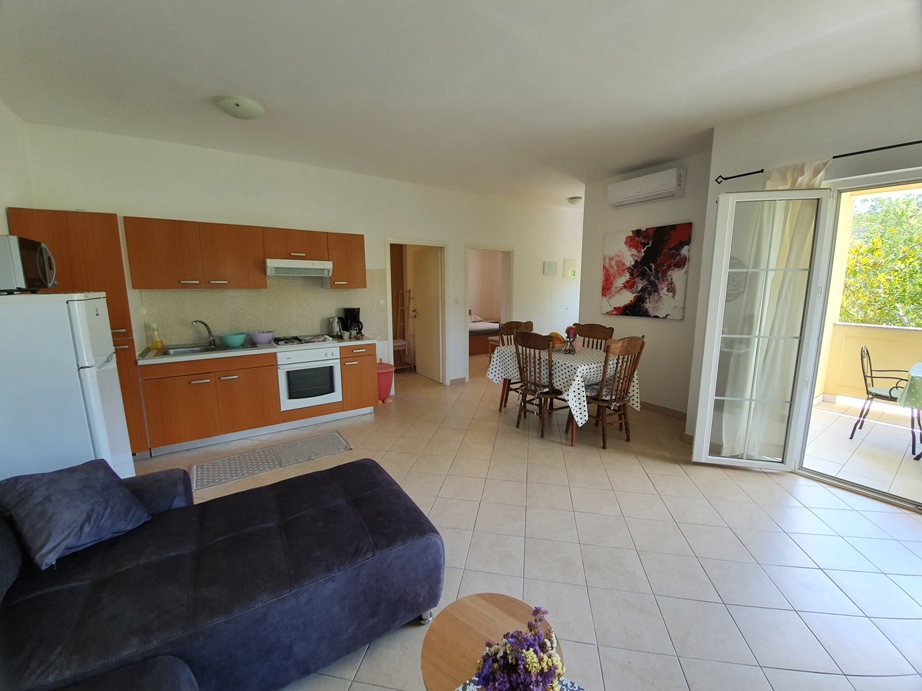 - Apartman čine 2 spavaće sobe (za 4 osobe), velika kuhinja (šporet, frižider, ostala oprema), trpezarija za 6 osoba, 1 kupatilo, klima uređaj i velika terasa sa pogledom na more.
